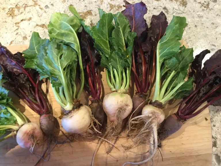 Indidentally, our hypocotyl root vegetables here are all varieties, or subspecies, of species that also produce familiar leafy vegetables: rutabagas and the Russian or Siberian kales; turnips and Napa cabbages and mizuna; beets and Swiss chard; celery root and celery stalks or seeds. In each of these cases the variety produced for leaves has a much less pronounced hypocotyl than the variety produced as a root vegetable. Similarly, while the leaves on our hypocotyl root vegetables are all edible, they will be smaller and tougher than those on the varieties that have been bred for leaves.