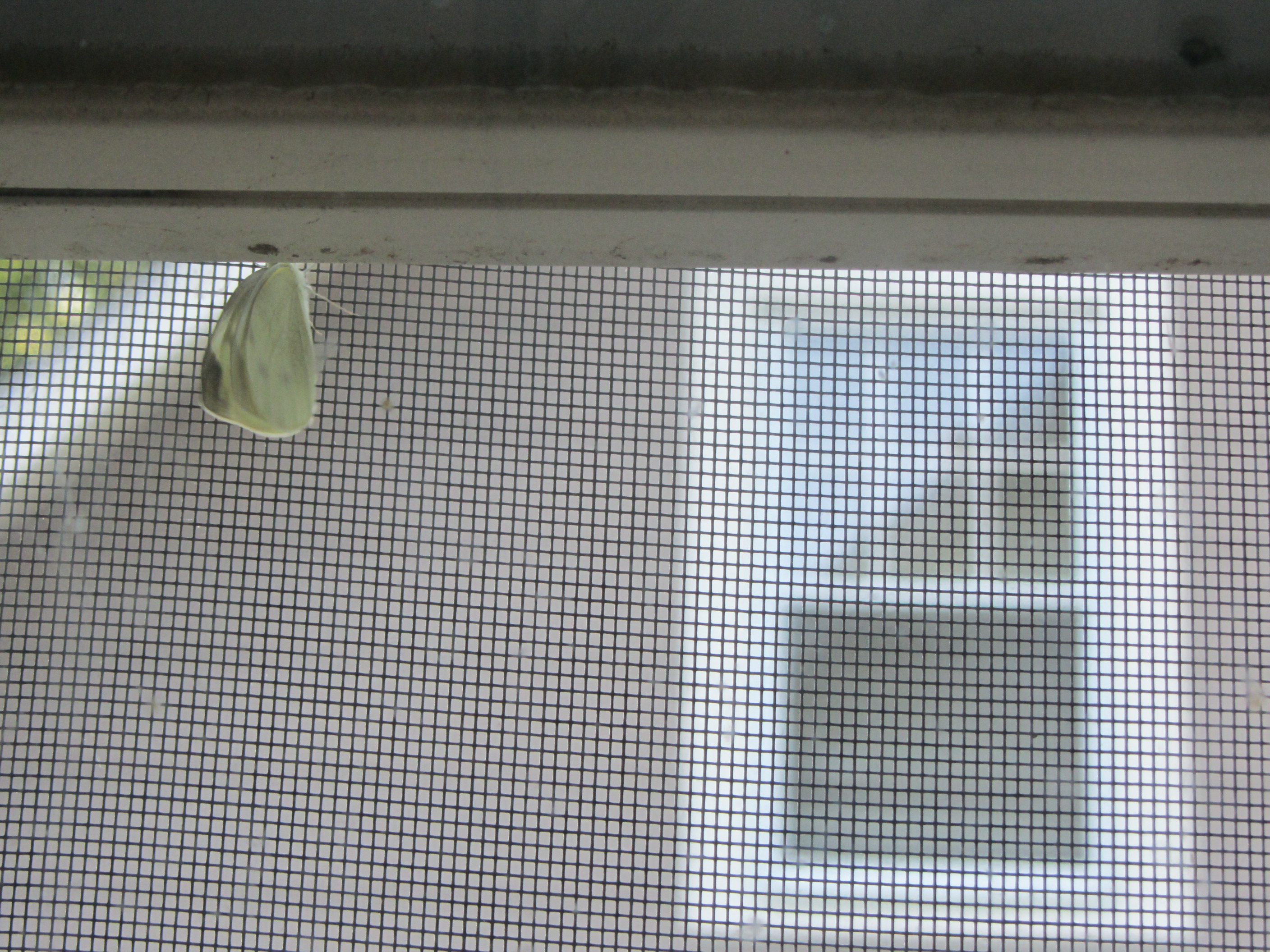Cabbage butterfly pupa on the tile above my sink. A survivor from washing crucifers from the garden.