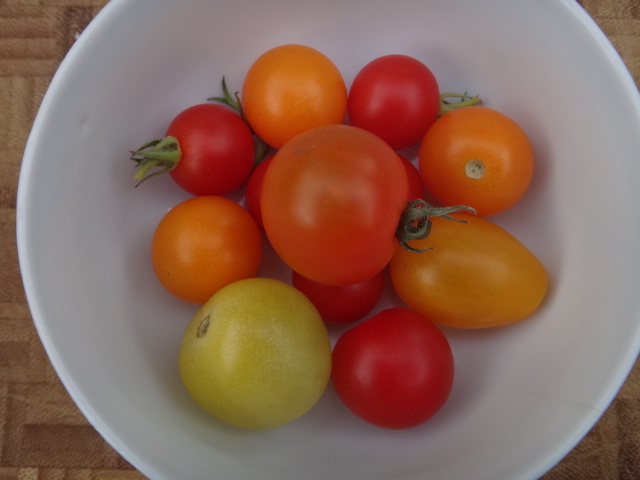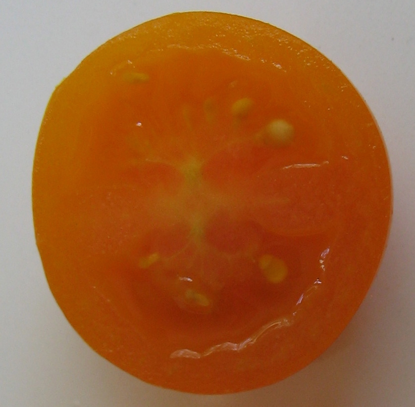 Cherry tomatoes still have the ancestral state of two locules separated by placenta. Larger tomatoes have many locules of irregular number and shape. They are neither completely filled with flesh, as the eggplant, nor open and dry, like the pepper. They have solid septa between locules, but the seeds are attached to a gelatinous part of the placenta. Sometimes the outside of a tomato is deeply lobed, cutting in between the locules.