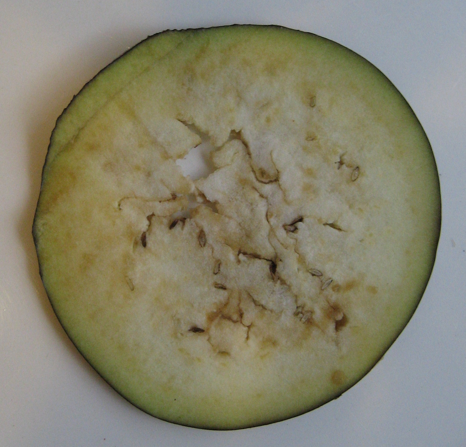 Some recipes recommend salting the eggplant to “remove bitterness.” I have never found the flesh of cooked eggplant to be bitter; and its distinctive flavor is what I like about it. Old skins can sometimes be harsh, so if your eggplants are not fresh, or the skins seem tough, you might peel them. Unfortunately, by removing the black-purple skin you will lose some of the color variation in the finished dish. Seeds in overly-mature fruits can also be a little harsh. If your seeds are very dark when the eggplant is freshly cut, you might avoid using the very center of the fruit. Even young seeds will darken as the fruit sits out. Speaking of seeds, notice how closely they resemble the seeds of peppers and tomatoes.