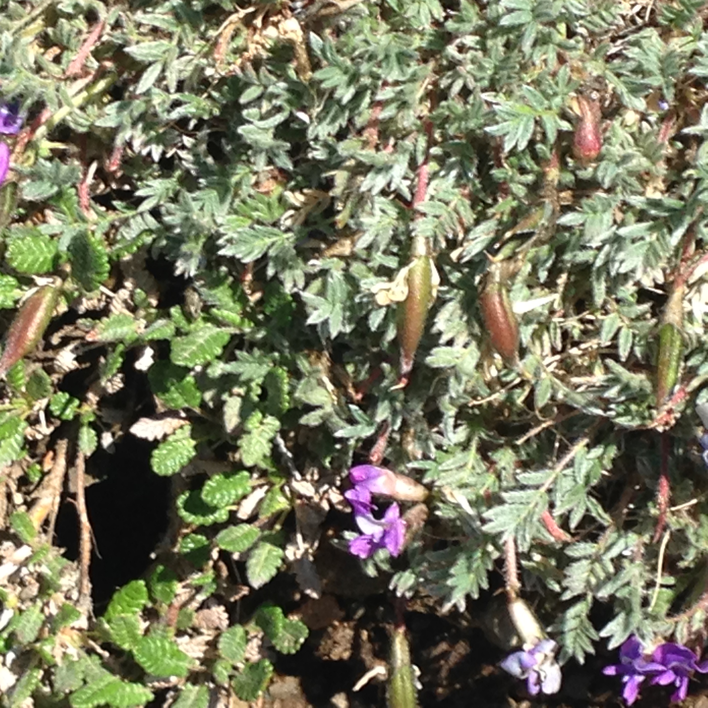 Fabaceae ← Previous Next → Alpine Oxytropis nigrescens has fuzzy trichome-colored leaves, while its adjacent Dryas does not.