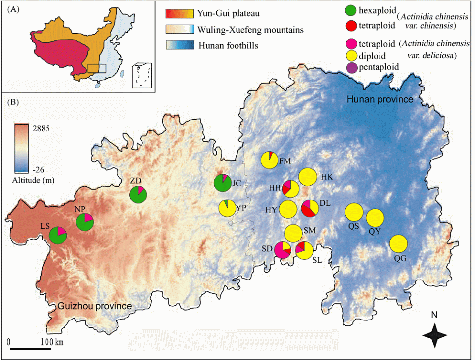 Fig. 1 from Li et al. (2010) showing progression of dominance from A. chinensis var. chinensis and polyploidy in western China to var. deliciosa and diploidy in the east: “The geographical distribution of 16 sample populations of Actinidia. A, The three steps of the Chinese topography are shown and the rectangle indicates the region in which the samples were obtained. B, Pie diagrams represent the proportion of ploidy races within each population. The colour spectrum of the map from blue to red indicates the altitude change.”