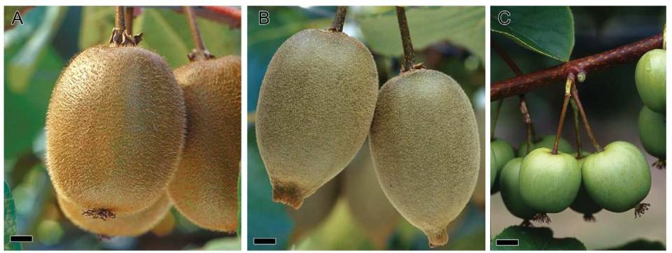Monkey peaches. Fig. 1 from Hallet and Sutherland (2005): mature fruits from (A) A. chinensis var. deliciosa (fruit color green), (B) A. chinensis var. chinensis (golden kiwi, fruit color yellow), and (C) A. arguta (kiwiberry). Bar = 10mm. Notice the prominent persistent stigmas on the distal end (opposite the stem).