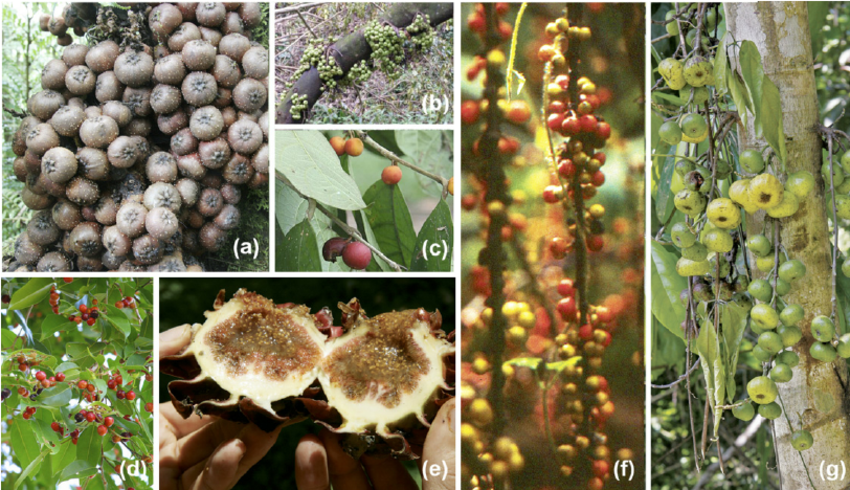 Figure 1 from Lomascolo et al. (2010): “Diversity of fruit characteristics in some figs from Papua New Guinea. ( A ) Ficus pachyrrachys, mean diameter ( x ) = 59.4 mm. ( B ) F. hispidoides , x = 52.1 mm. ( C ) F. subulata , x = 11.3 mm. ( D ) F. benjamina , x = 9.8 mm ( E ) F. dammaropsis , x = 69.5 mm. This is a fi g cut in half to show the numerous tiny seeds. ( F ) F. pungens, x = 9.0 mm. ( G ) F. congesta , x = 40.8 mm. A , B , and G show the typical bat-syndrome traits. C , D , and F show the typical bird-syndrome traits.”