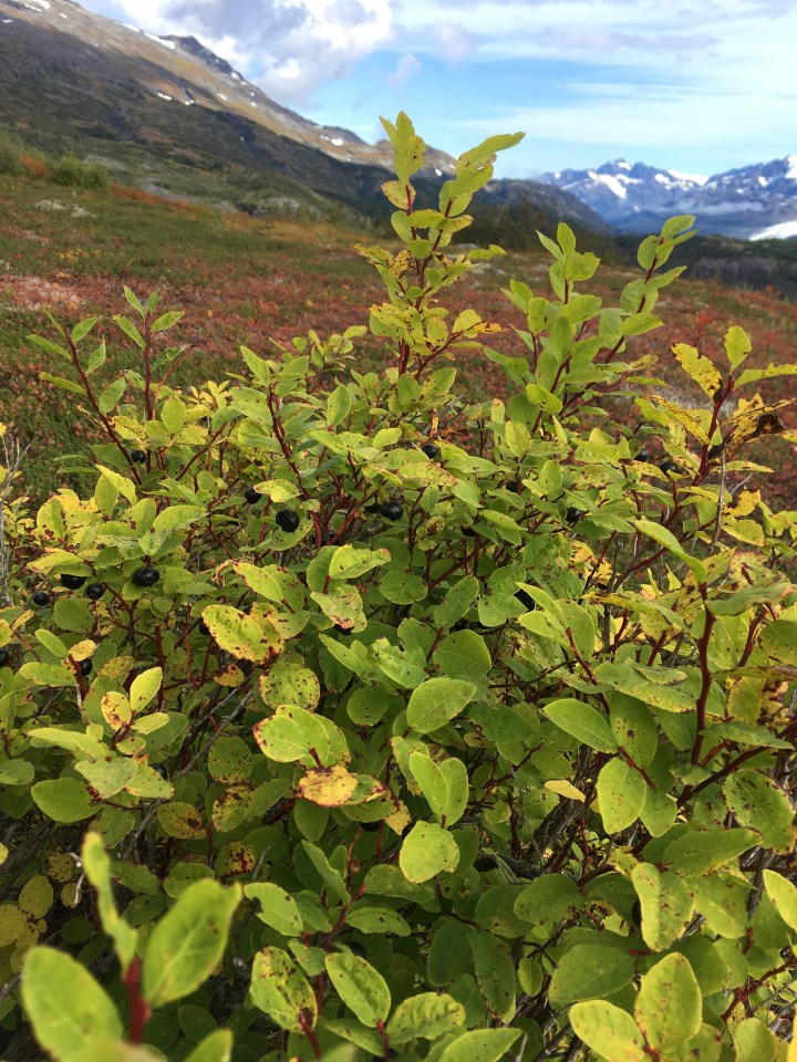 Ericaceae ← Previous Next → Highbush blueberry (Vaccinium alaskaense), in September in Alaska. The leaves are beginning to yellow, revealing carotenoids underneath the chlorophyll. The berries are full of anthocyanins.