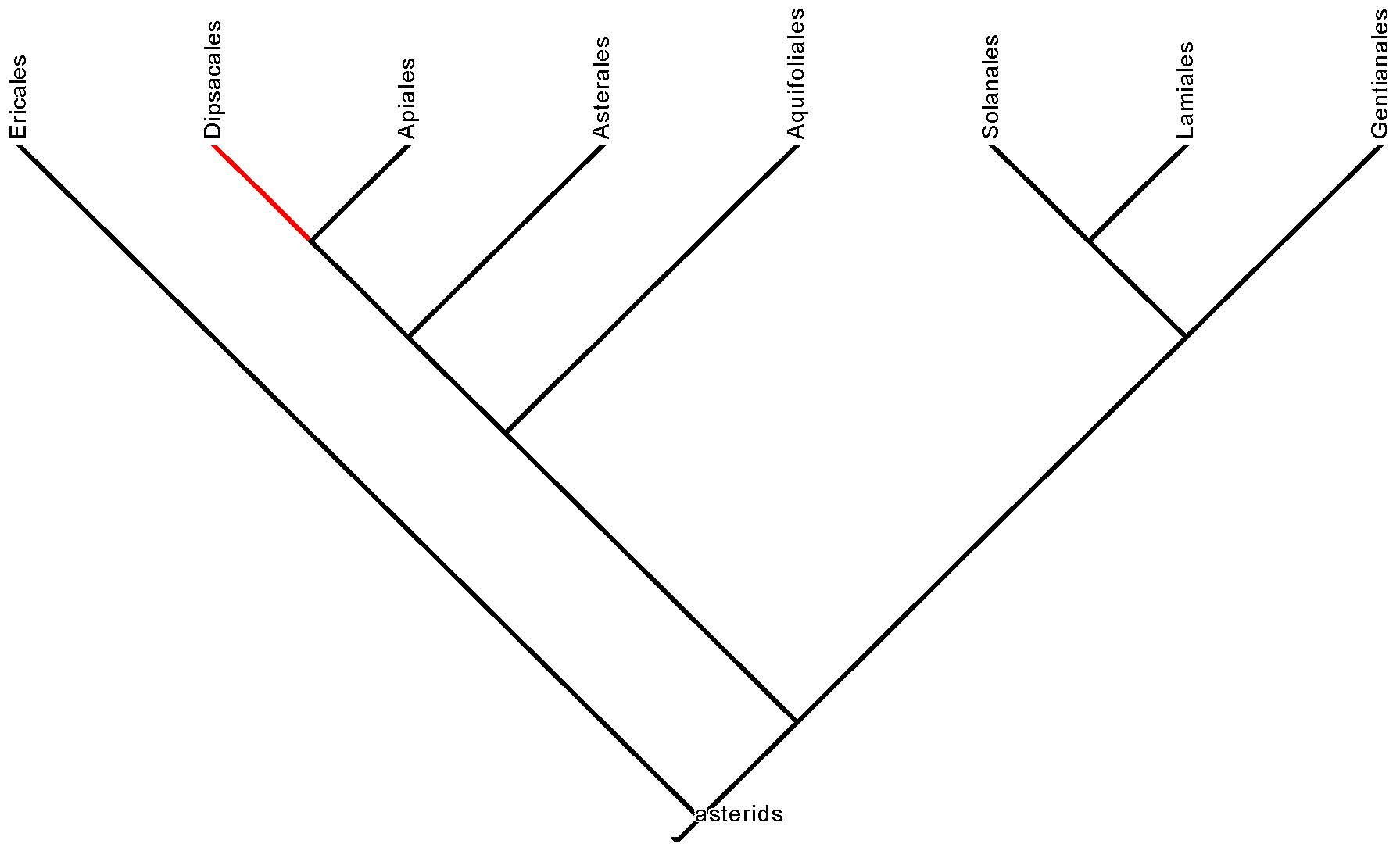 Phylogeny of plant taxonomic orders with edibles (click the tree to enlarge). Orders with species with lemony essential oils are highlighted in red. For a refresher on reading this phylogeny, please see our food plant tree of life page.
